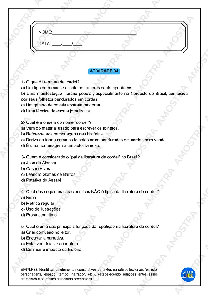 São mais de 20 páginas de Atividades de Literatura de Cordel para o Fundamental 2 (6º ao 9º ano) que, além de conter gabaritos e códigos das habilidades, têm cabeçalhos editáveis em Word...